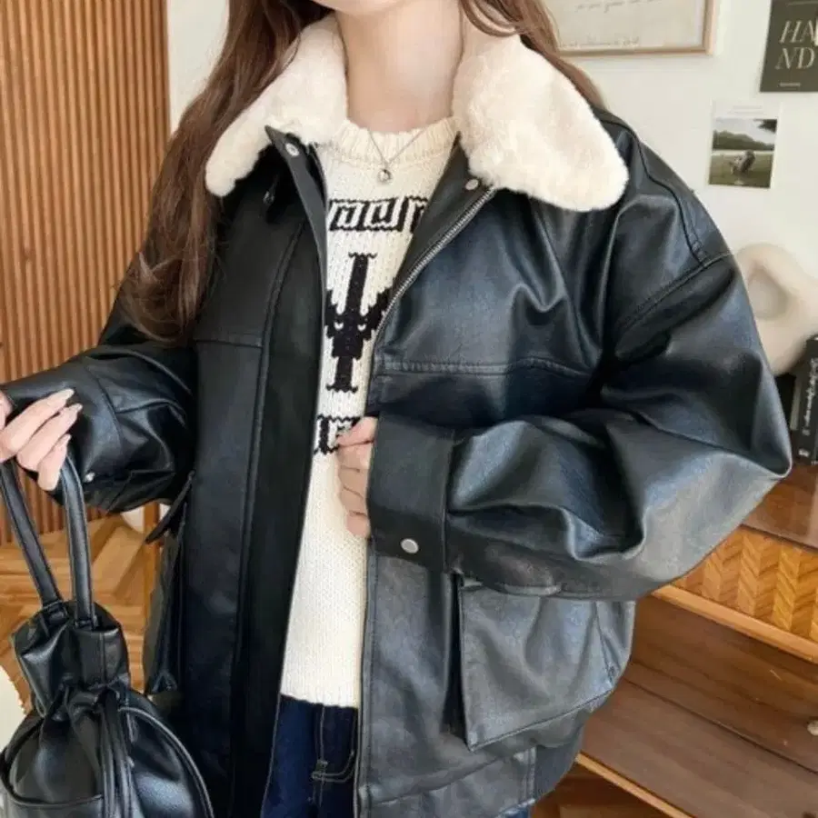 퍼 블랙 가죽 아우터 쁘띠머플러