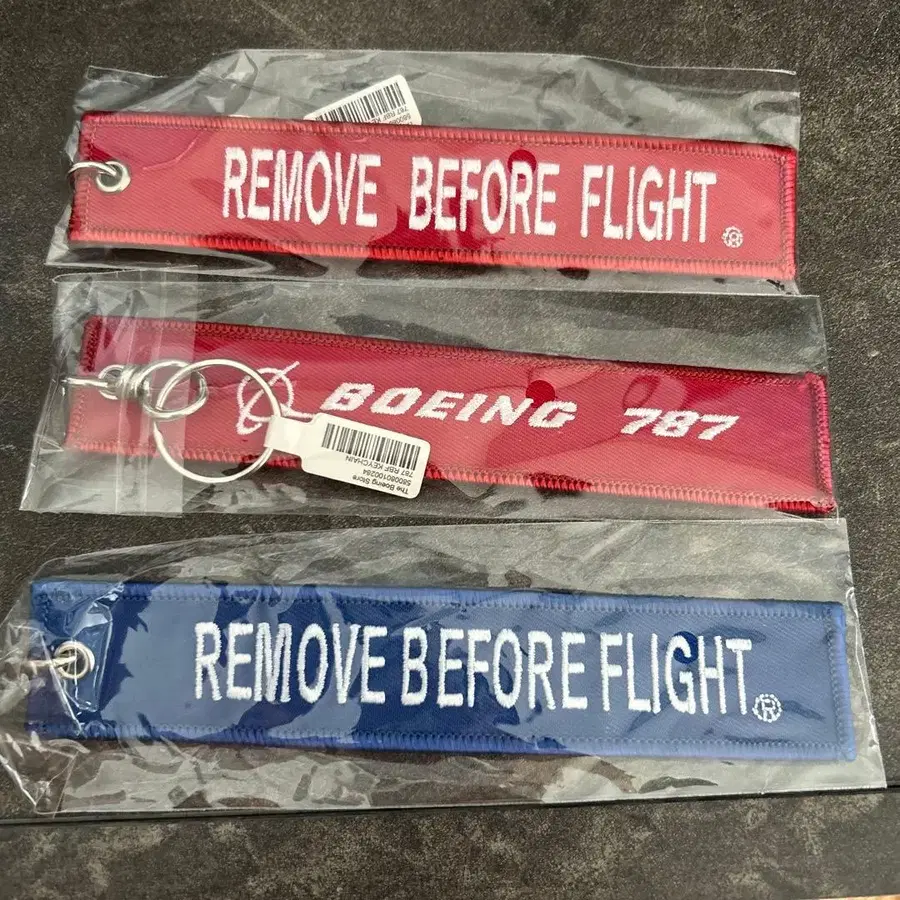 - 색상: 빨간색 - 색상: 파랑 - 모델명: Boeing 787 - 텍스트: REMOVE BEFORE FLIGHT - 텍스트: REMOVE BEFORE FLIGHT