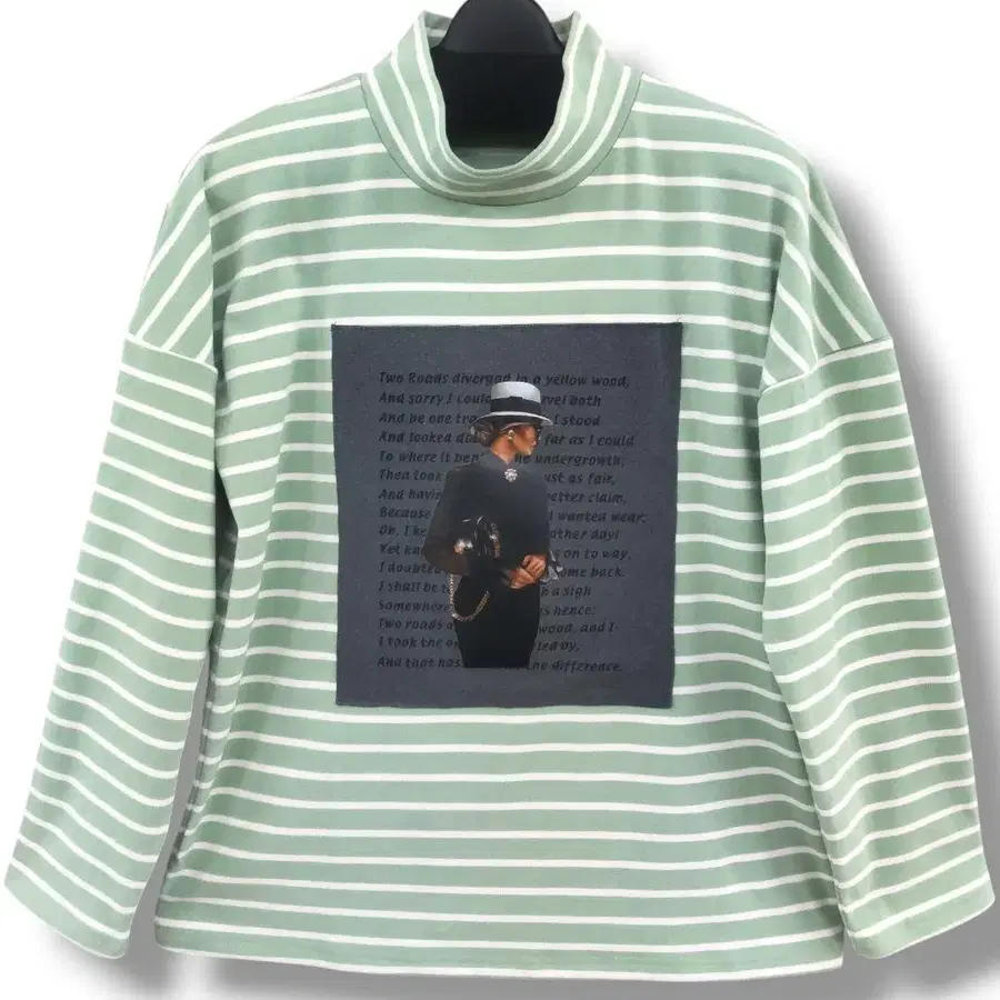 하이넥 상의 티셔츠 페일 그린 보더 마쉬멜로우 소재 가로 줄무늬