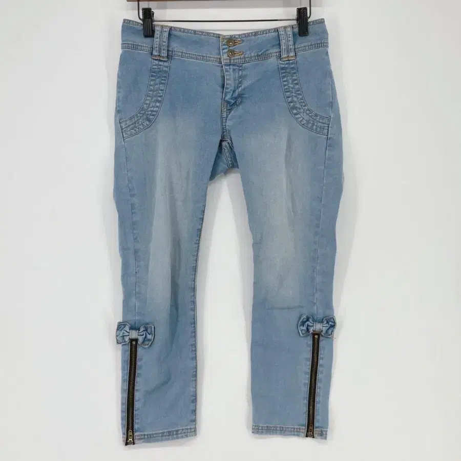 라이트 블루 데님에 밑단의 지퍼와 리본 모티브가 포인트입니다. 움직이기 편한 스트레치성을 갖춘 소재로 쾌적한 착용감을 선사합니다.