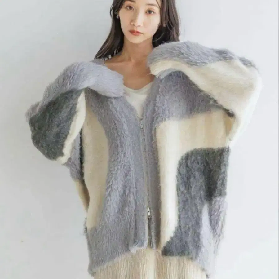 COCO DEAL 더블 페이스 페더 니트 아우터 라이트 그레이