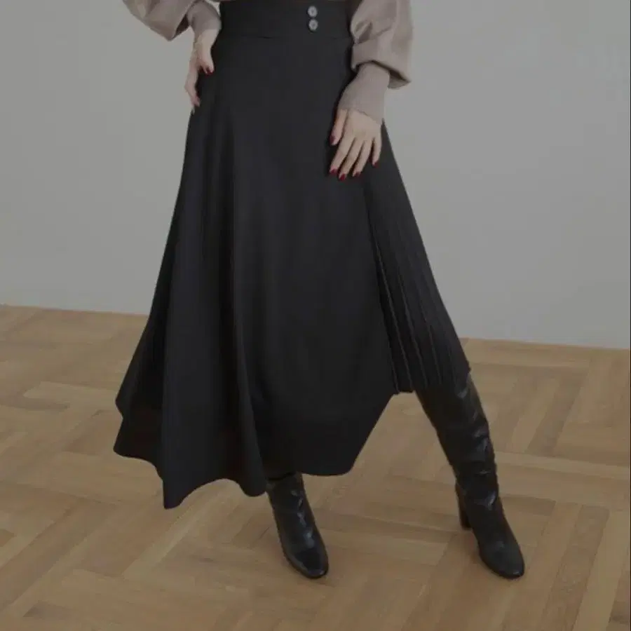 자동 번역되었어요. 원문보기플레어 디자인과 플리츠가 특징인 블랙 롱 스커트.