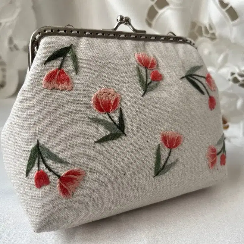 튤립을 모티브로 한 자수가 사랑스러운 가마구치 파우치입니다.