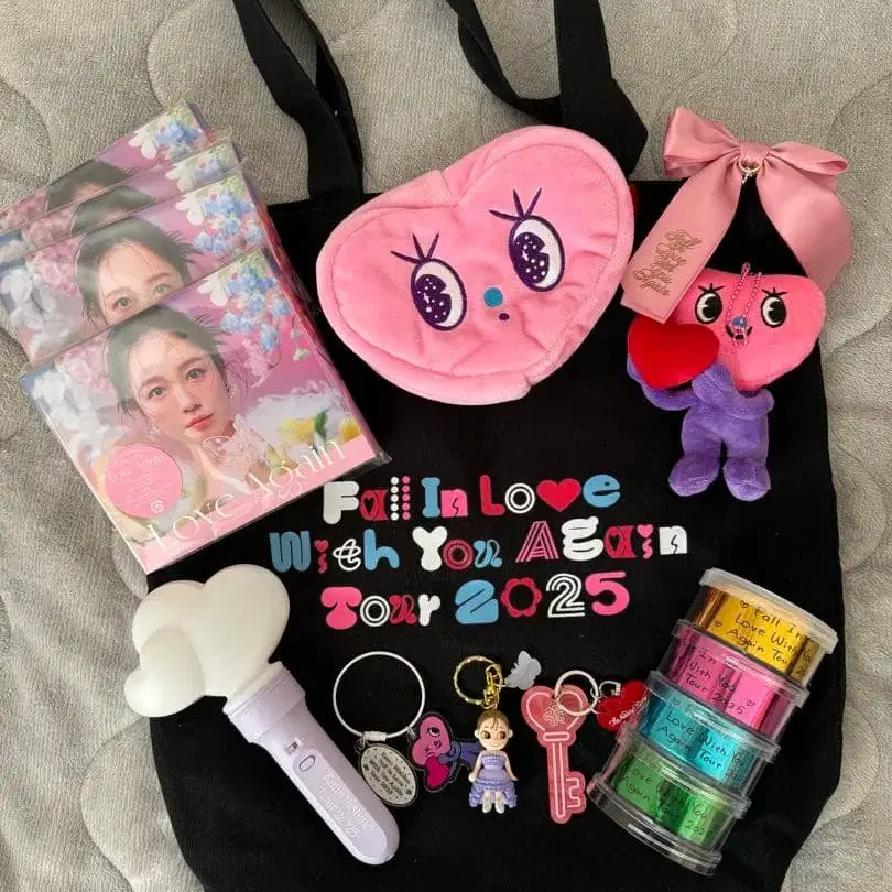 Fall In Love With You Again Tour 2025 굿즈입니다. ※ 세트 판매. 낱개 판매 불가. 가격 인하 가능. 2회 정도 Live에서 사용했습니다. 더블 하트 후리후라 점등 확인 완료 지퍼 토트 Black 리본 머리끈 마스코트 키링 Love Again Live 2024 ver. 더블 하트쨩 아크릴 키링 더블 하트쨩 봉제 인형 키링 더블 하트쨩 파우치 은색 테이프 4종 Love Again 초회반 특전 포함 니시노가 팬클럽 특전 키링 니시노 카나 카나땅 굿즈