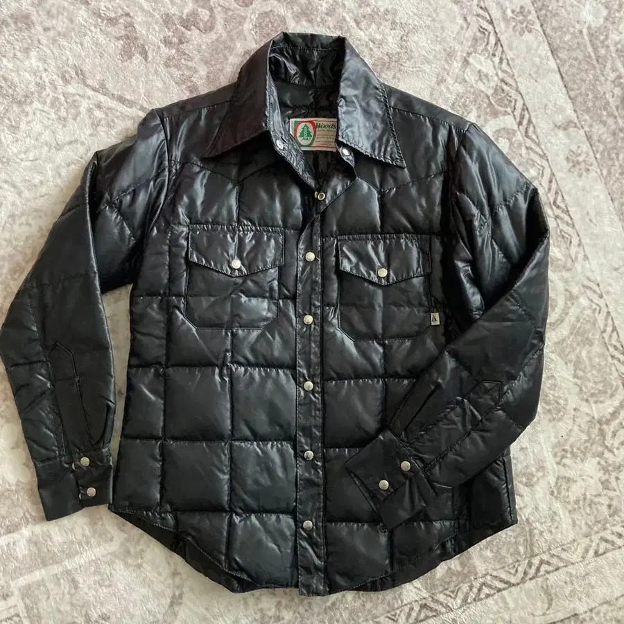 블랙 다운 셔츠입니다. 버튼이 달린 포켓과 슬림한 실루엣으로 스타일리시한 디자인을 자랑합니다.