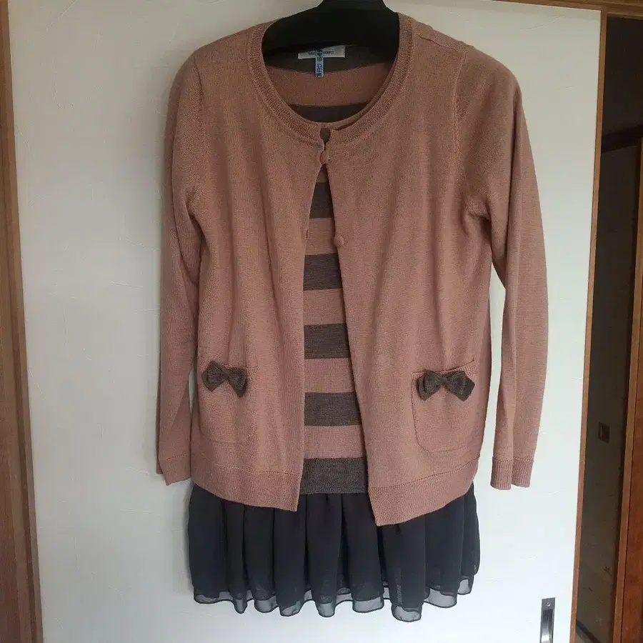 스모크 핑크 리본 포함 가디건 긴팔 튜닉