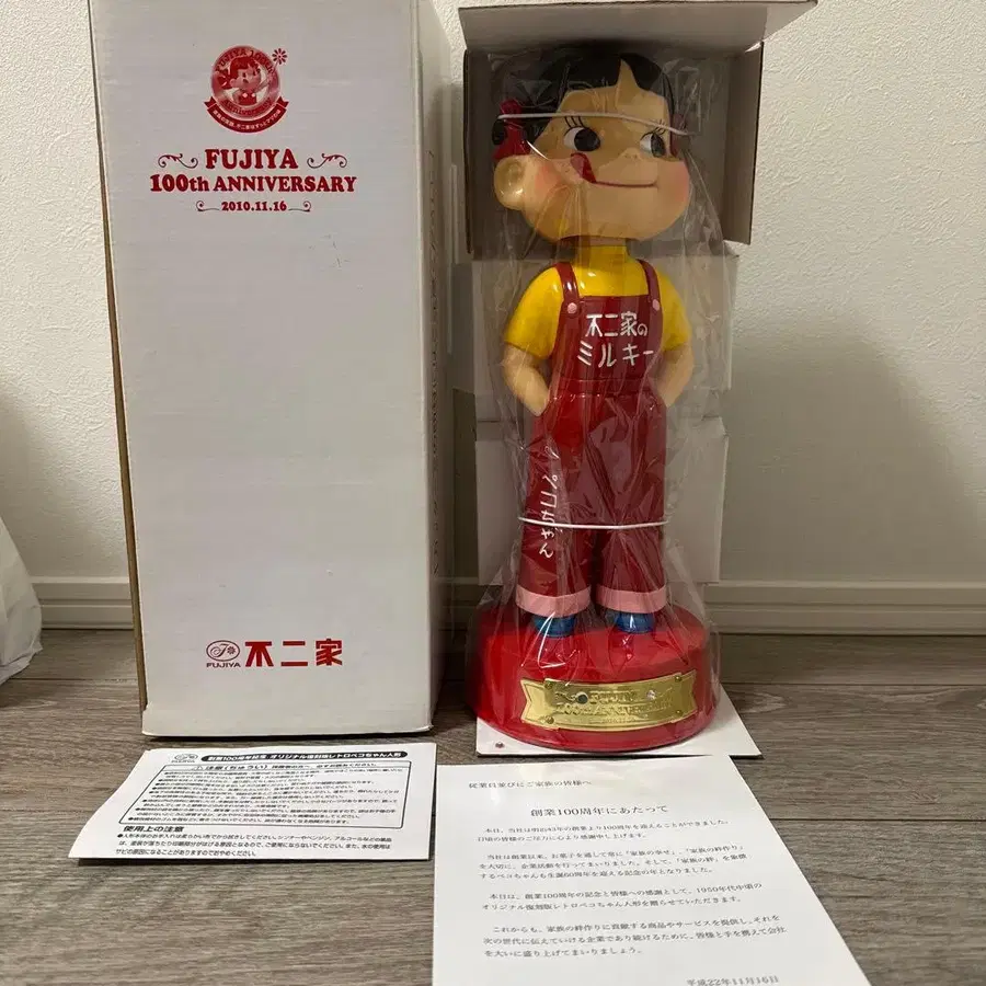 후지야 창업 100주년을 기념한 오리지널 복각판 레트로 페코짱 인형입니다. 본체는 미개봉 상태이나, 노후화로 인해 받침대의 돌이 떨어져 있었습니다. (떨어진 돌은 별도로 동봉합니다.)