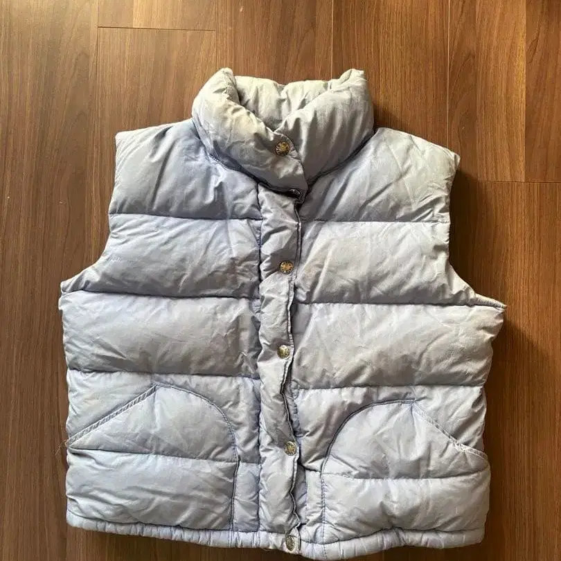 스카이블루 색상의 퀼팅 다운 베스트입니다. 스탠드 카라와 프론트 포켓이 있으며, 심플한 디자인이 매력적입니다.