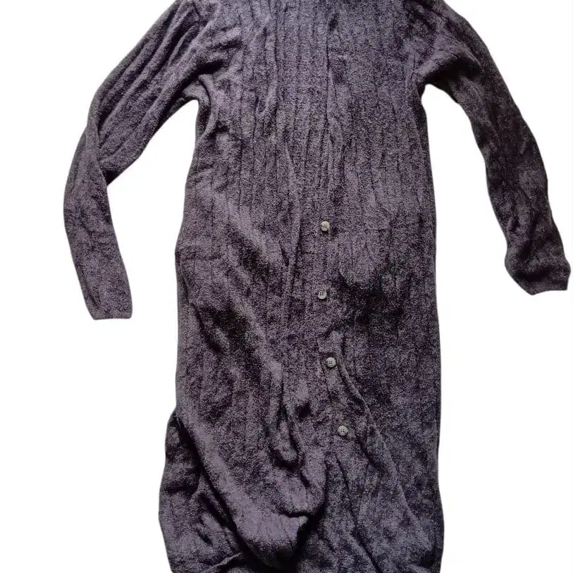 다크 그레이 색상의 롱 가디건과 와이드 팬츠 세트. 부드러운 소재로 쾌적한 착용감.