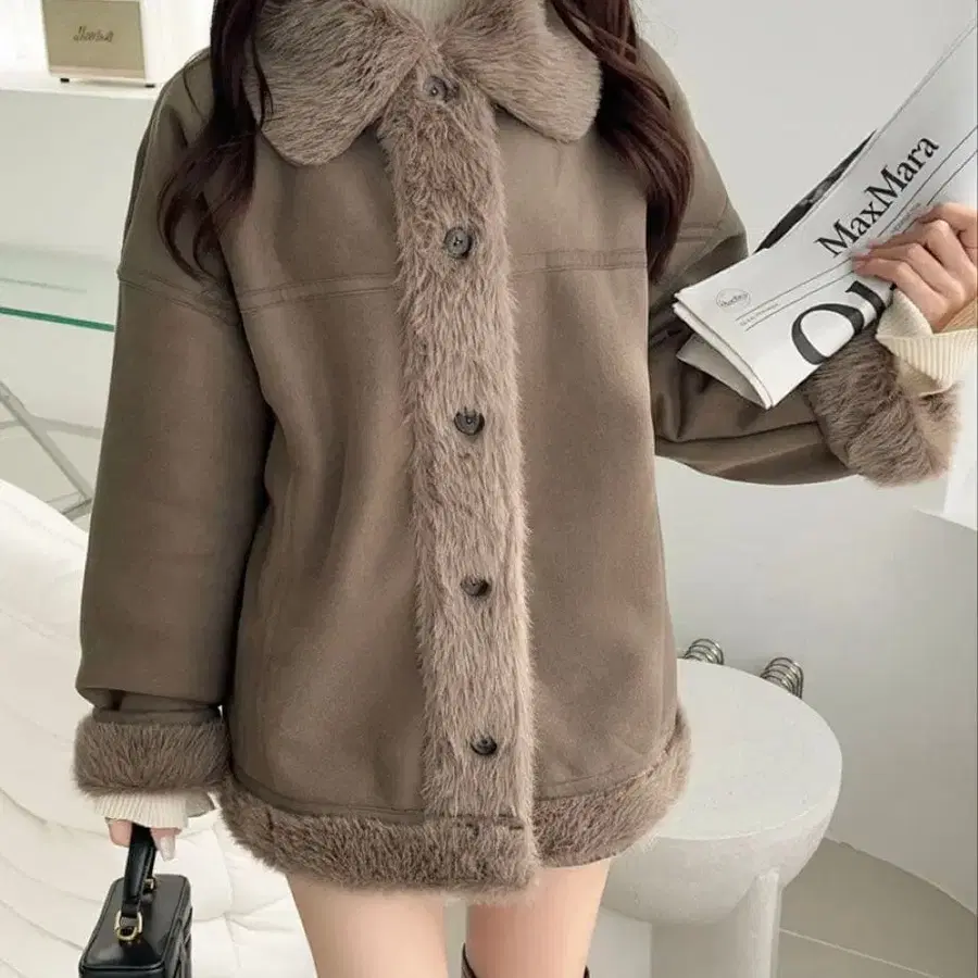 달콤함과 기품으로 겨울을 즐기세요. 퍼 절개 스웨이드 라이크 코트