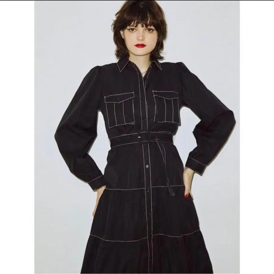 밑단으로 갈수록 풍성하게 퍼지는 티어드 원피스에 배색 스티치와 밀리터리 포켓으로 포인트를 더한, 하나만으로도 완성되는 주역급 아이템.