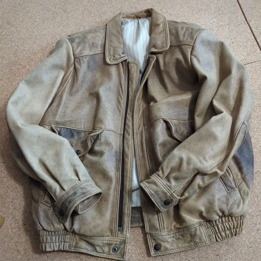 베이지 색상의 가죽 자켓, 지퍼식, 스트라이프 안감 부착. 친정에서 보관하던 제품입니다. 약간의 사용감이 느껴지지만, 자세한 내용은 사진을 참고해 주세요. - 색상: 베이지 - 소재: 가죽 - 디자인: 지퍼식, 포켓 부착 - 안쪽 소재: 스트라이프 패턴 안감 - 특징: 어깨 부분, 엉덩이 부분 등에 색바램 있음. 방문해 주셔서 감사합니다. 색상 - 베이지 계열 얼룩, 찢김 등 - 약간 있음