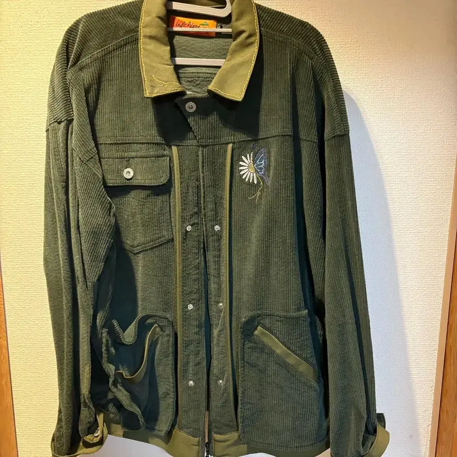 올리브 그린 색상의 코듀로이 자켓, 나비와 꽃 자수가 특징입니다.