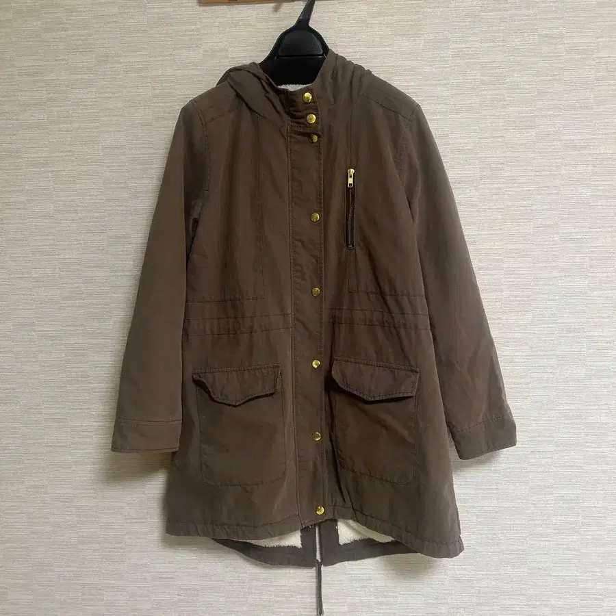 자동 번역되었어요. 원문보기후드 부착 브라운 모즈 코트, 지퍼 포켓과 골드 컬러 버튼이 특징.