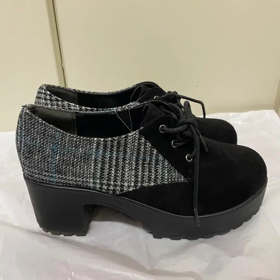 스웨이드와 트위드의 콤비네이션으로, 통굽 힐의 레이스업 슈즈. - 브랜드: Zipper - 색상: 블랙/그레이 - 소재: 스웨이드/트위드 - 스타일: 힐 포함 슈즈 - 디자인: 레이스업 - 힐 높이: 약 8cm - 특징: 통굽 한 번만 착용했기 때문에, 꼭 신어주시면 좋겠습니다. 여성용 신발 귀여운 사랑스러운 세련된 멋진