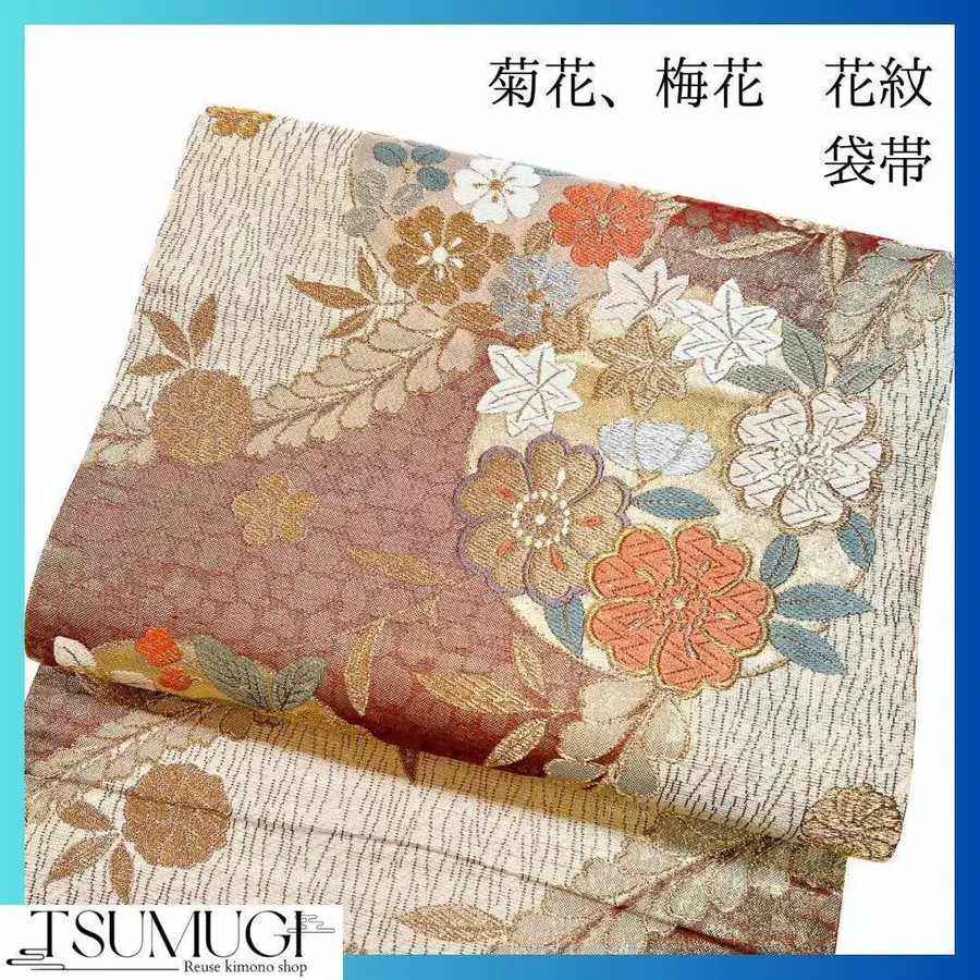 국화, 매화, 꽃 무늬가 짜인 후쿠로 오비입니다.