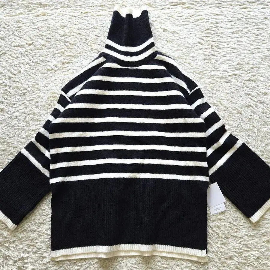 블랙과 화이트 보더 디자인의 터틀넥 니트.