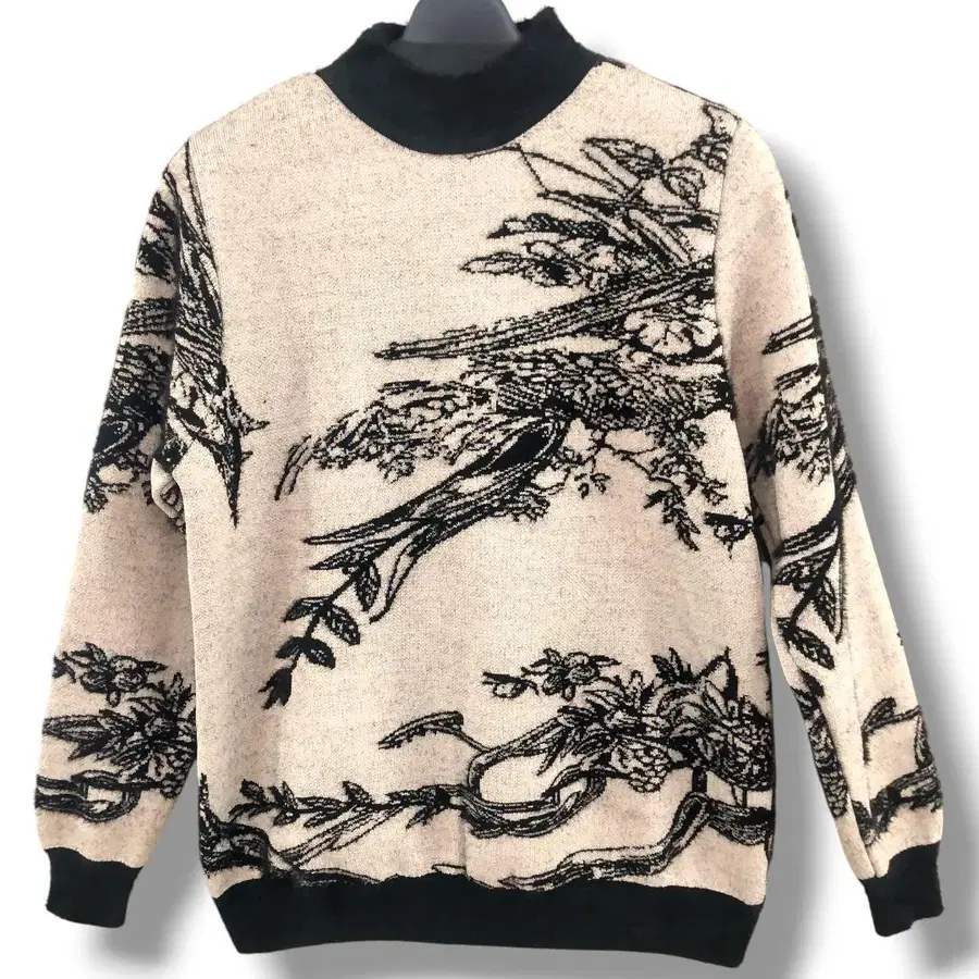 니트 스웨터 풀오버 리프 무늬 수묵화 샤기 하이넥 베이지