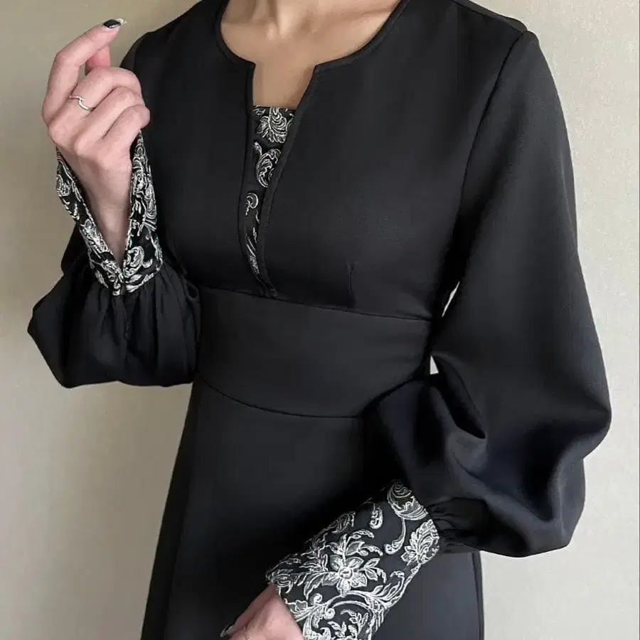JUNOAH 자카드 키넥 머메이드 원피스 긴팔 블랙 XL