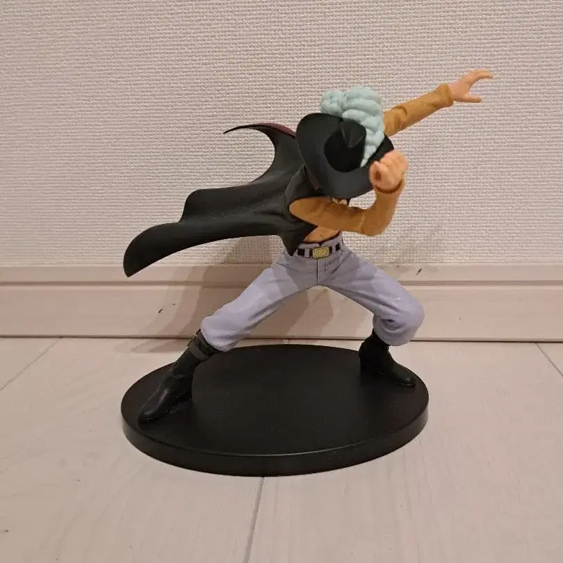 원피스 캐릭터가 공격적인 포즈로 서 있는 피규어. - 캐릭터명: 원피스 캐릭터 - 포즈: 공격적인 포즈 - 복장: 블랙 망토와 옐로우 컬러 셔츠 - 머리 색깔: 스카이블루 - 베이스: 블랙 베이스 방문해 주셔서 감사합니다.