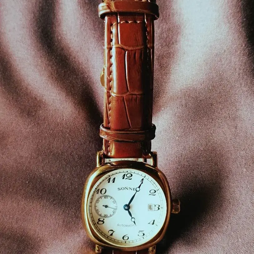 자동 와인딩 기능을 갖춘 SONNE 손목시계, 프레게 침, 화이트 다이얼, 아라비아 숫자, 스몰 세컨드, 날짜 표시 및 스테인리스 스틸 케이스가 특징입니다. - 브랜드: SONNE - 모델: 기계식 자동 와인딩 시계 - 벨트 소재: 가죽 - 케이스 소재: 스테인리스 스틸 - 특징: 날짜 표시 방문해 주셔서 감사합니다. 자세한 내용은 이미지로 확인 부탁드립니다. 설명문 첫 부분의 특징이 있으며, 업무나 프라이빗한 상황에서도 유용하게 사용할 수 있다고 생각합니다. 주의 사항 파워 리저브 기능이 작동하지 않거나 적은 것인지 알 수 없으나, 착용하지 않으면 하루를 넘기지 못합니다. 분해 조정이 필요합니다. 벨트와 벨트 고정구는 정품이 아닙니다. 케이스 등에 흠집, 스크래치가 있습니다. 기본적으로 정크로 간주합니다. 환불 및 반품은 받지 않습니다. 위 사항에 납득하신 분만 부탁드립니다. 케이스 등,