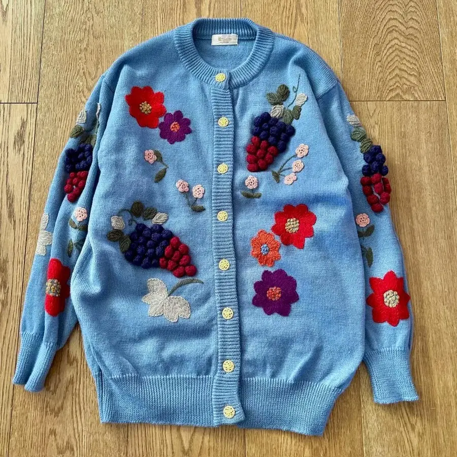 빈티지 레트로 니트 가디건 3D 입체 모티브 포도 꽃