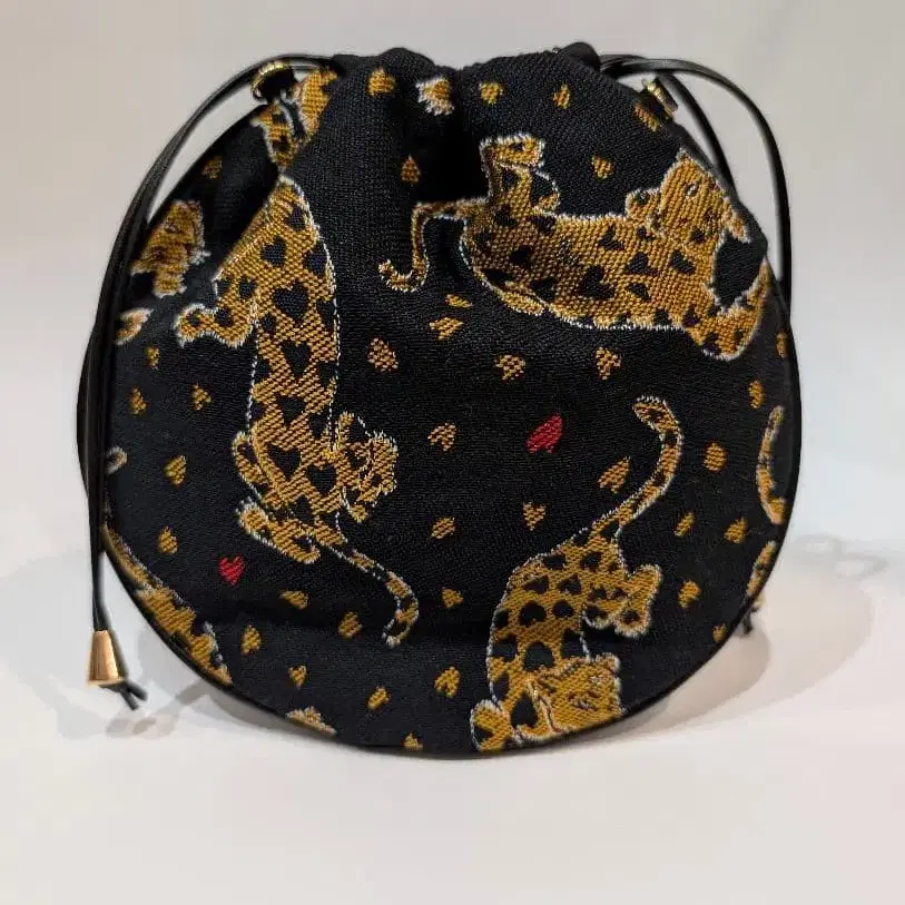 고급 원단의 레오파드와 하트가 인상적인 애니멀 무늬 자카드 원단에 가죽 소재를 조합하여, 달콤함을 억제한 어른들을 위한 둥근 복조리 백입니다.
