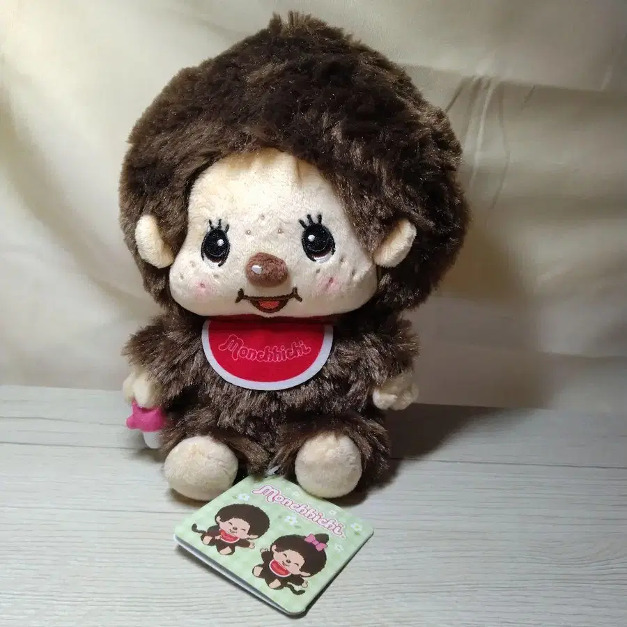 몬치치의 통통한 손뜨개 봉제 인형, 약 18cm의 브라운 컬러로, 레드 턱받이와 택 포함. - 캐릭터: 몬치치 - 색상: 브라운 (본체), 레드 (턱받이) - 사이즈: 약 18cm - 부속품: 택 포함 방문해 주셔서 감사합니다.