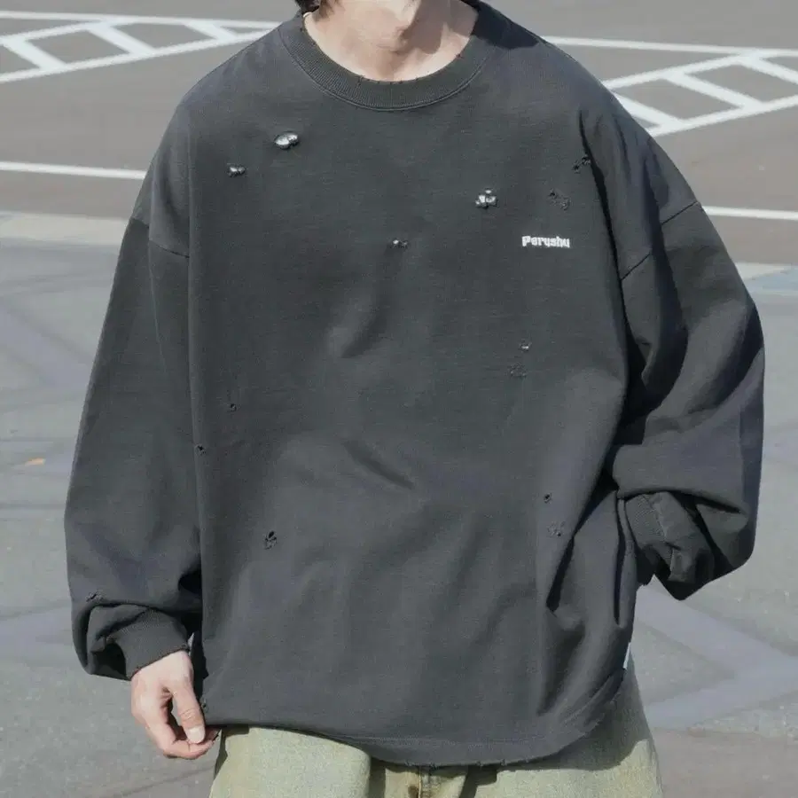 Perushu 자수 로고 데미지 긴팔 T셔츠