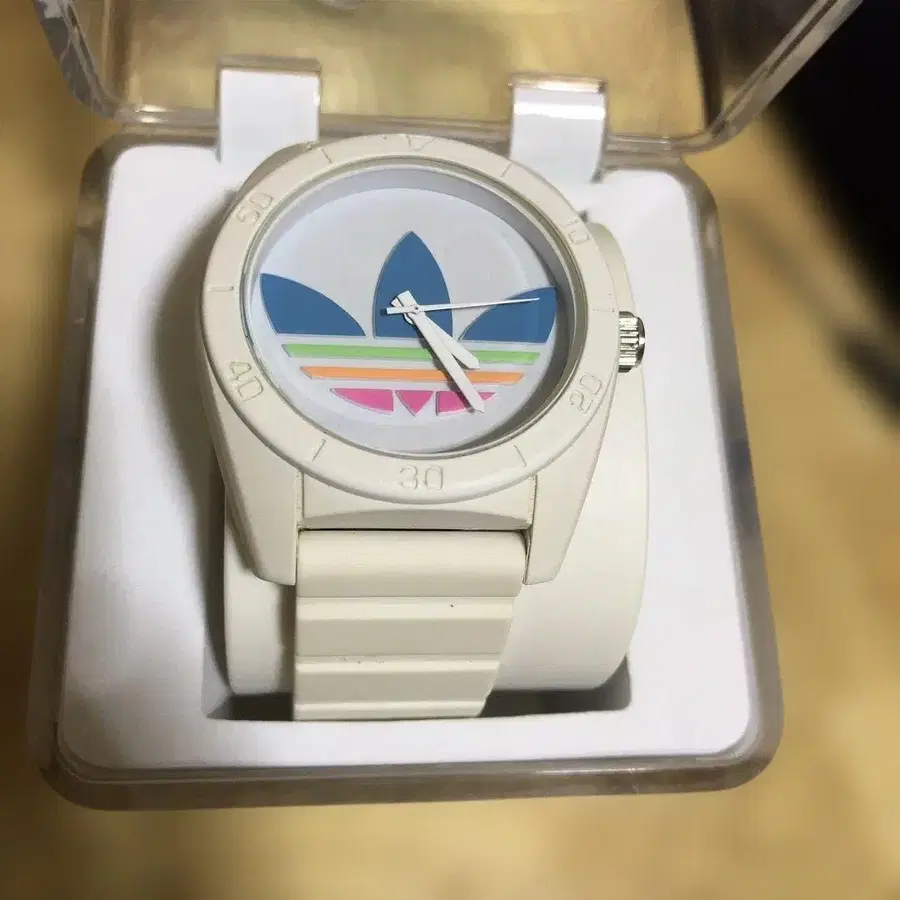 화이트 색상의 실리콘 밴드와 로고가 새겨진 다이얼의 아디다스 오리지널스 시계. - 브랜드: adidas - 모델: 오리지널스 - 색상: 화이트 - 디자인: 로고 다이얼 - 부속품: 전용 케이스 - 밴드 소재: 실리콘 배터리 교환 완료