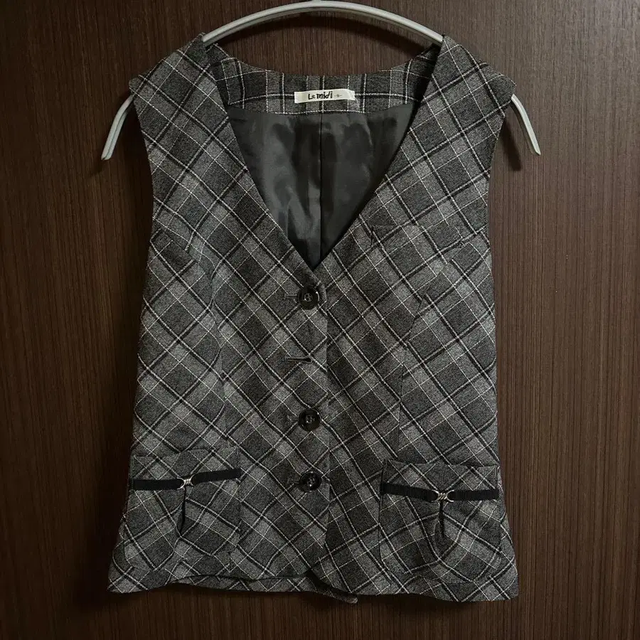 그레이 체크 무늬 베스트와 블랙 스커트 세트