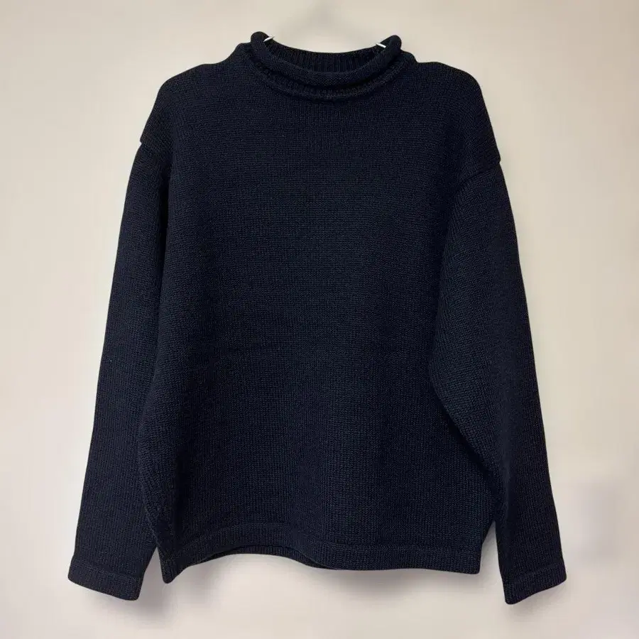 100% 메리노울 소재의 네이비 색상 스웨터입니다. 릴랙스 핏으로 편안한 착용감을 제공합니다.