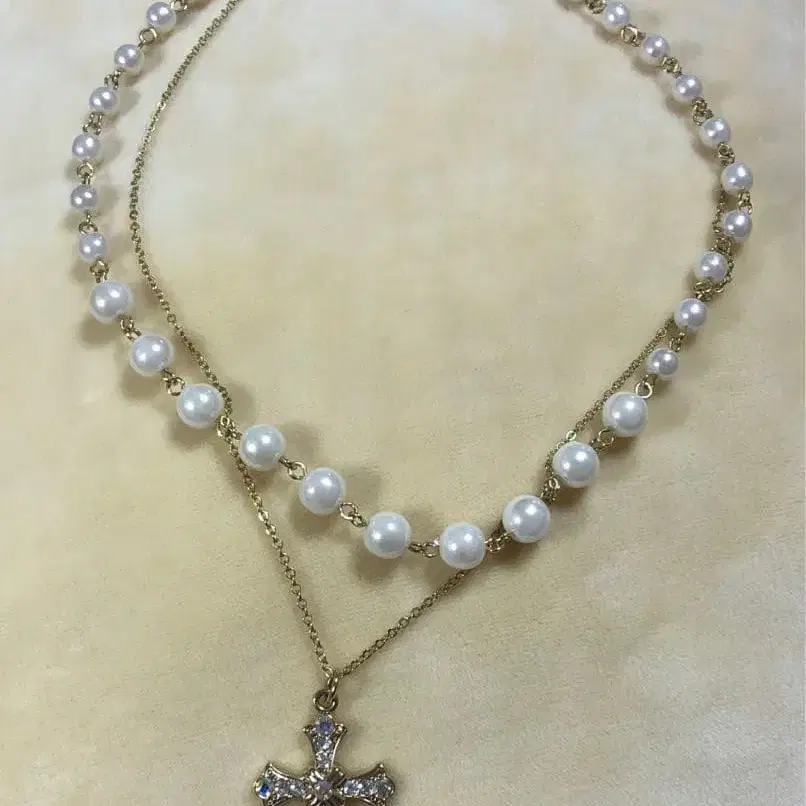 펄 골드 크로스 목걸이 로사리오 십자가 2연 목걸이