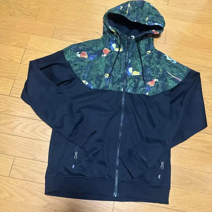 자동 번역되었어요. 원문보기후드 부착, 앵무새 프린트 디자인의 후드티.