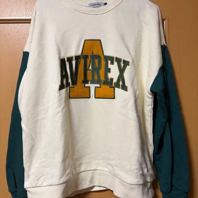 아이보리와 그린의 대비가 매력적인 AVIREX 크루넥 트레이닝복.