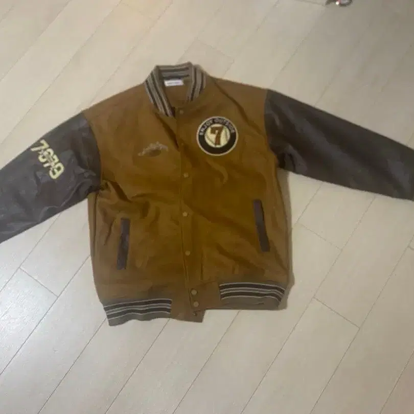 가죽과 폴리에스테르 바시티 자켓, 브라운과 블랙의 콤비네이션, 백 프린트 포함. - 브랜드: CLASSIC REBOOT - 색상: 브라운/블랙 - 스타일: 바시티 자켓 - 소재: 가죽/폴리에스테르 - 디자인: 백 프린트 있음 방문해 주셔서 감사합니다. 사이즈 - L
