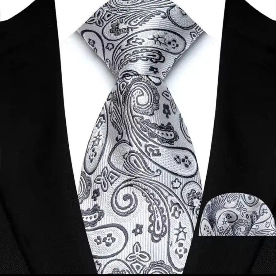 [ 새상품 ] 페이즐리 화이트 실버 넥타이 포켓 치프 포함 146cm