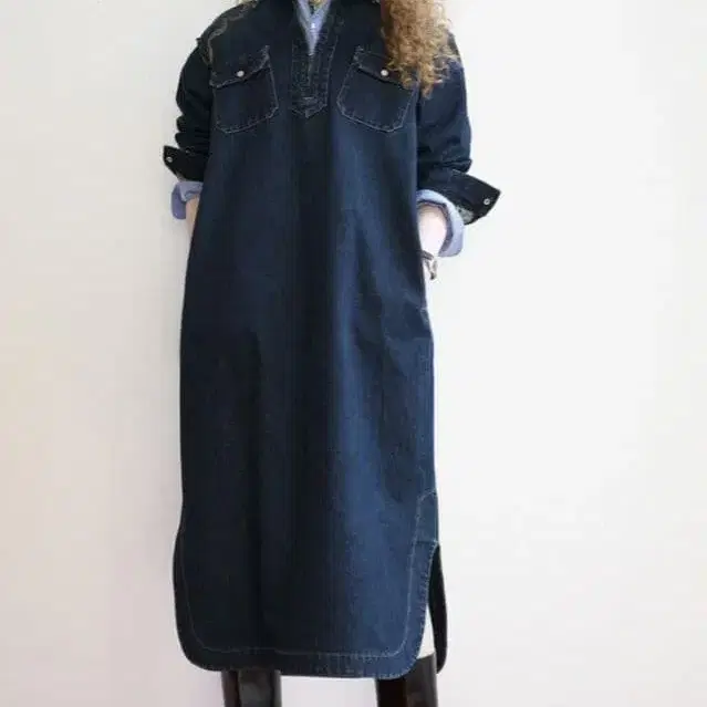 워크 셔츠의 디테일을 접목한 데님 소재의 드레스입니다. 암홀의 봉제선을 겉으로 드러내어 가공 시 생긴 구김이 악센트가 되었습니다. 사이드에 깊은 슬릿이 들어간 무릎 기장이라, 하나만 입고 부츠를 매치하는 것은 물론, 데님에 맞춘 데님 on 데님 코디네이트 등 다양한 스타일링을 즐길 수 있습니다. 있을 듯 없었던 신선한 디자인입니다.
