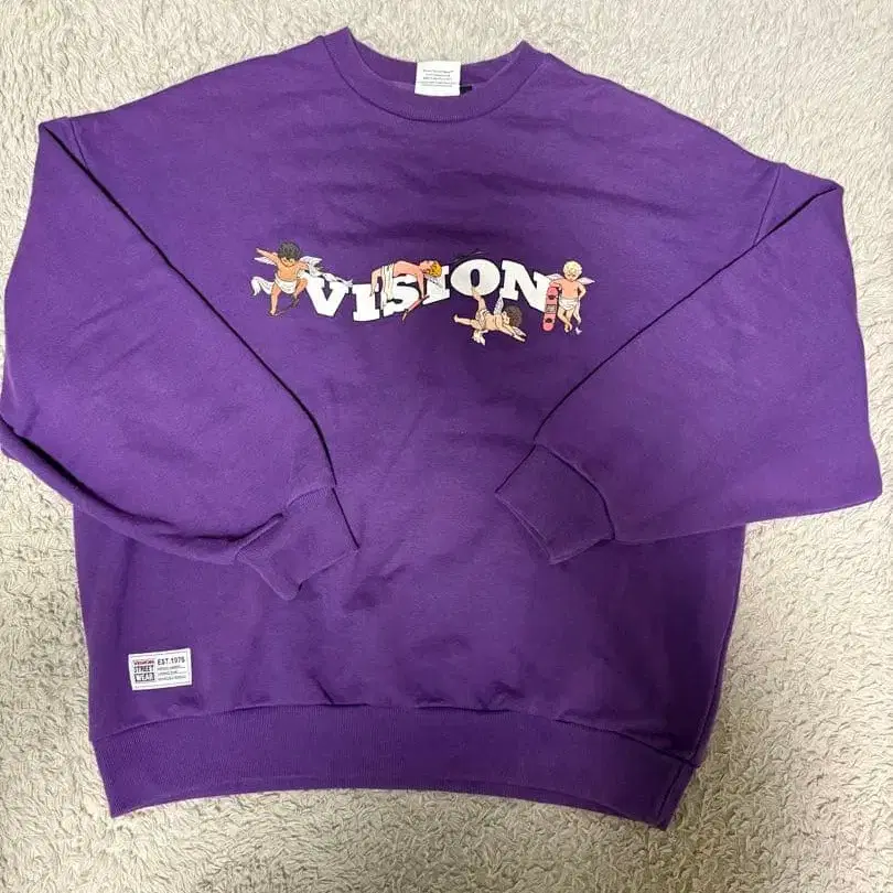 자동 번역되었어요. 원문보기보라색 VISION STREET WEAR 맨투맨, 유니크한 캐릭터 프린트 포함.