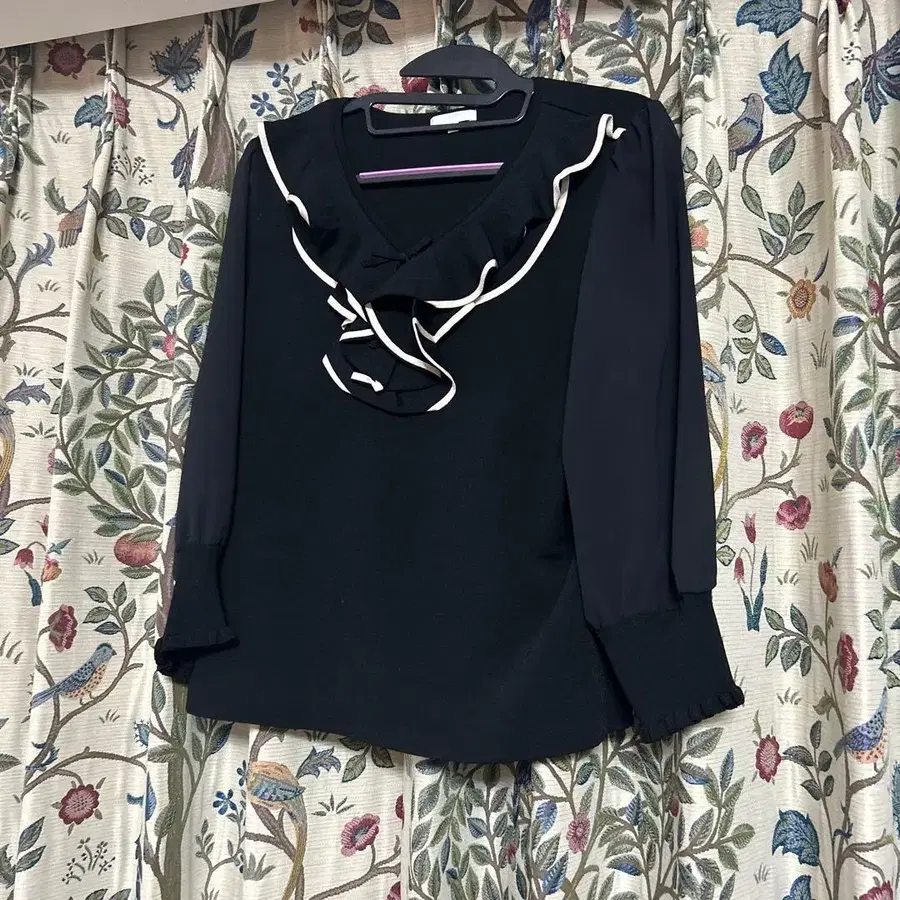 프릴이 달린 블랙 긴팔 블라우스로, 엘레강트한 V넥 디자인이 특징입니다. - 색상: 블랙 - 디자인: 프릴 V넥 - 소매 길이: 긴팔 방문해 주셔서 감사합니다.
