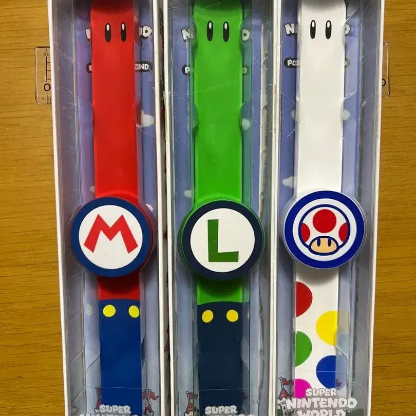슈퍼 닌텐도 월드의 마리오, 루이지, 버섯 디자인의 파워업 밴드 3개 세트.