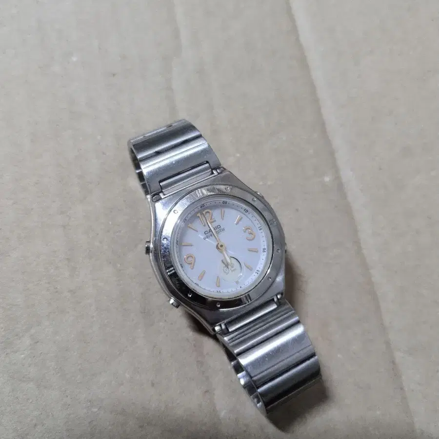 작동품입니다. 실버 색상의 스테인리스 스틸 밴드를 가진 화이트 다이얼의 전파 솔라 쿼츠 손목시계입니다. 팔 둘레는 최대 약 17.5cm입니다.