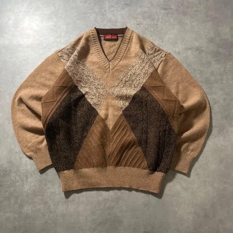 니트 스웨터 브이넥 황토색 레트로 빈티지 개성파 기하학 패턴 L