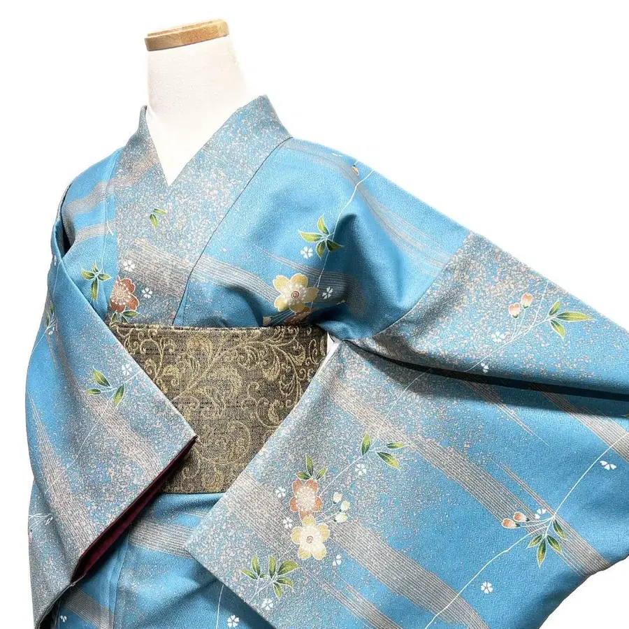 탁한 터콰이즈 블루 색상의 바탕에 노을과 흩뿌려진 문양, 늘어진 벚꽃 문양이 세련된 디자인의 한 벌입니다.