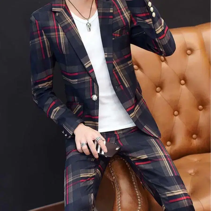 네이비와 레드 체크 무늬가 특징인 캐주얼 수트. - 디자인: 체크 무늬 - 색상: 네이비, 레드, 베이지 - 프론트 버튼: 있음 - 소매 버튼: 있음 - 포켓: 있음 방문해 주셔서 감사합니다. 사이즈 - M