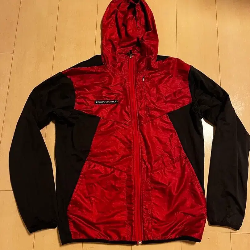 자동 번역되었어요. 원문보기경량 후드 부착 TOUR WORLD 자켓, 레드와 블랙의 콤비네이션.