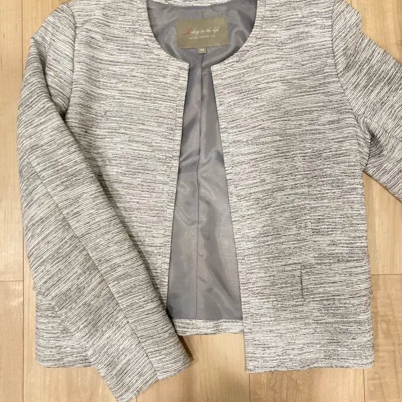 적당한 탄력이 있는 트위드 소재를 사용한 노카라 자켓입니다. 넥라인과 프론트의 절개를 얇게 하여 깔끔한 실루엣을 연출합니다.