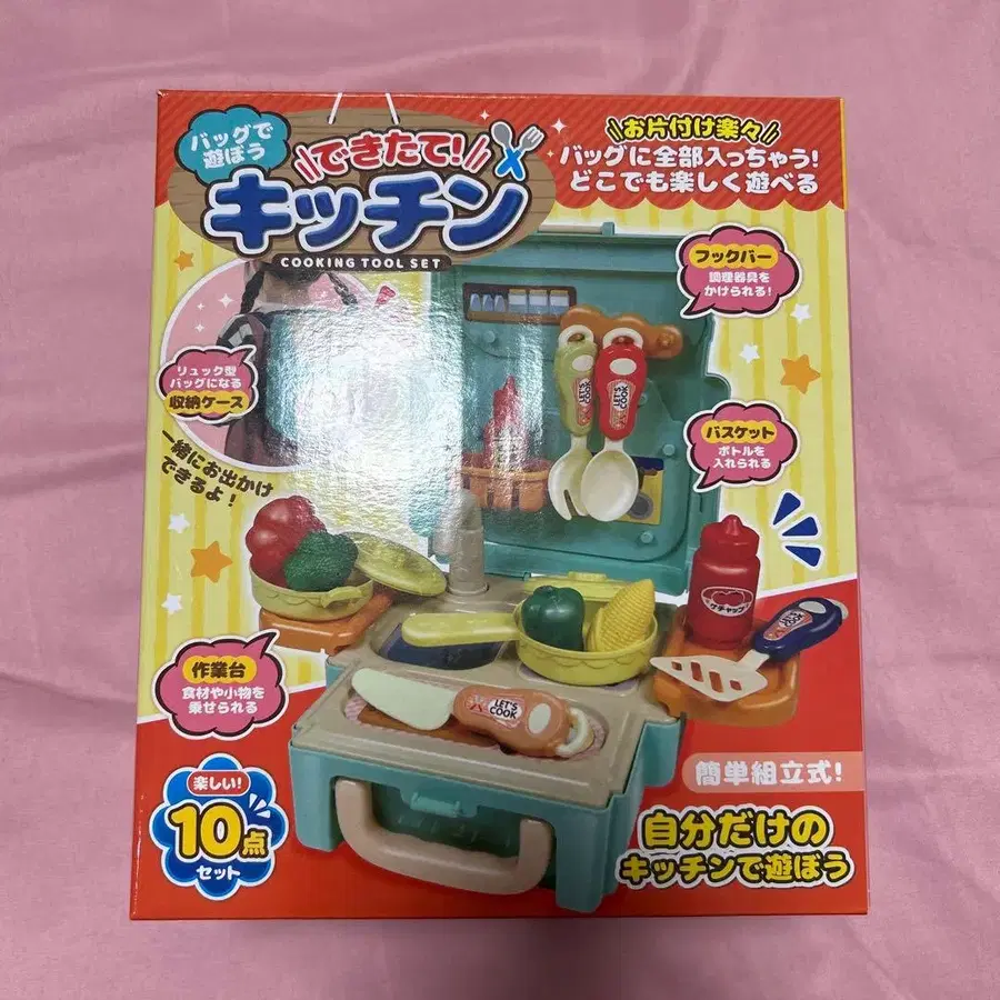 백팩이 되는 소꿉놀이 세트입니다. 놀 수 있도록 씰을 붙였더니 그걸로 만족해서 한 번도 가지고 놀지 않았습니다. 사진처럼 비닐에 담긴 채로 있습니다. 크기는 사진을 참고해 주세요.
