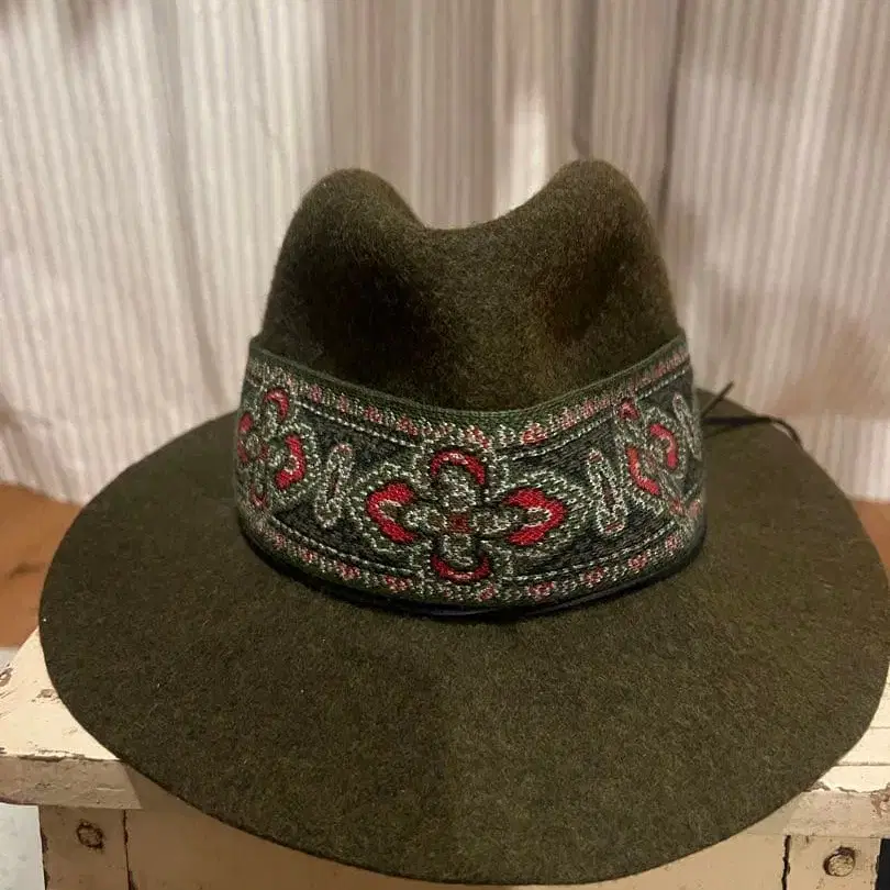 올리브 그린 색상의 울 소재 펠트 햇입니다. 자수 밴딩이 특징입니다. - 색상: 올리브 그린 - 장식: 자수 밴딩 - 소재: 울 - 스타일: 펠트 햇 방문해 주셔서 감사합니다.