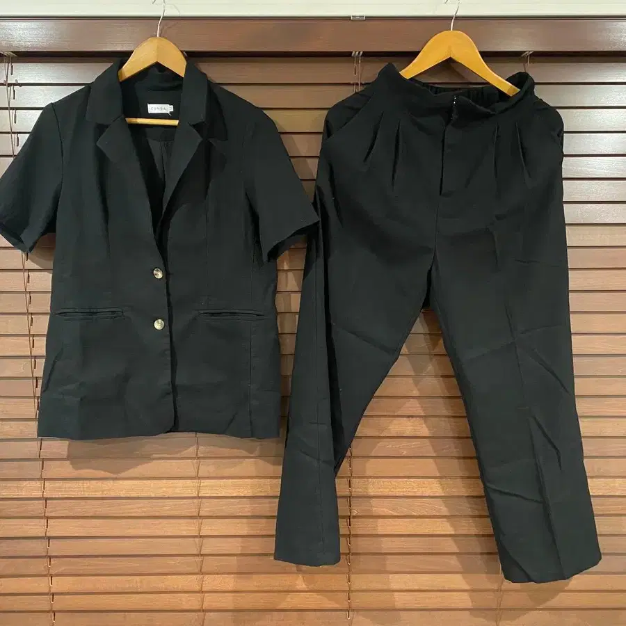 CENEA 린넨 혼방 반팔 자켓 + 하이웨스트 팬츠 셋업 블랙 M